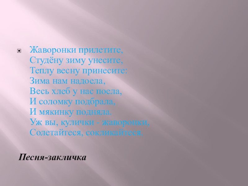 Жаворонки прилетите, Студёну зиму унесите, Теплу весну принесите: Зима нам надоела, Весь хлеб у нас поела, И