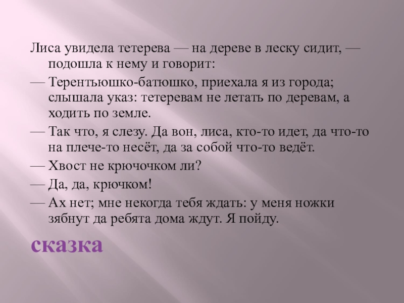 — Терентьюшко-батюшко, приехала я из города; слышала указ: тетеревам не летать по деревам, а ходить по земле.