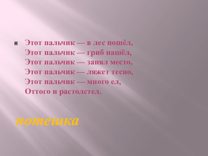 — занял место, Этот пальчик — ляжет тесно, Этот пальчик — много ел, Оттого и растолстел.