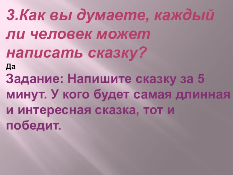 3.Как вы думаете, каждый ли человек может написать сказку?ДаЗадание: Напишите сказку за 5 минут. У кого будет