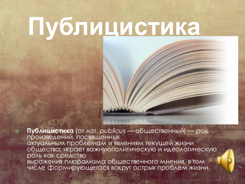 ПублицистикаПублици́стика (от лат. publicus — общественный) — род произведений, посвященных актуальным проблемам и явлениям текущей жизни общества; играет важнуюполитическую и идеологическую роль как средство выражения плюрализма общественного мнения, в том числе формирующегося вокруг острых проблем жизни.