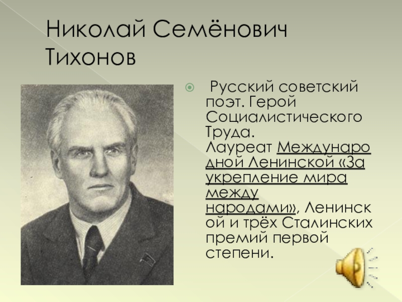Николай Семёнович Тихонов Русский советский поэт. Герой Социалистического Труда. Лауреат Международной Ленинской «За укрепление мира между народами», Ленинской и трёх Сталинских премий первой
