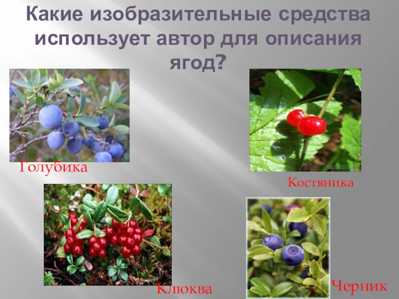 Какие изобразительные средства использует автор для описания ягод?КлюкваГолубикаКостяникаЧерника