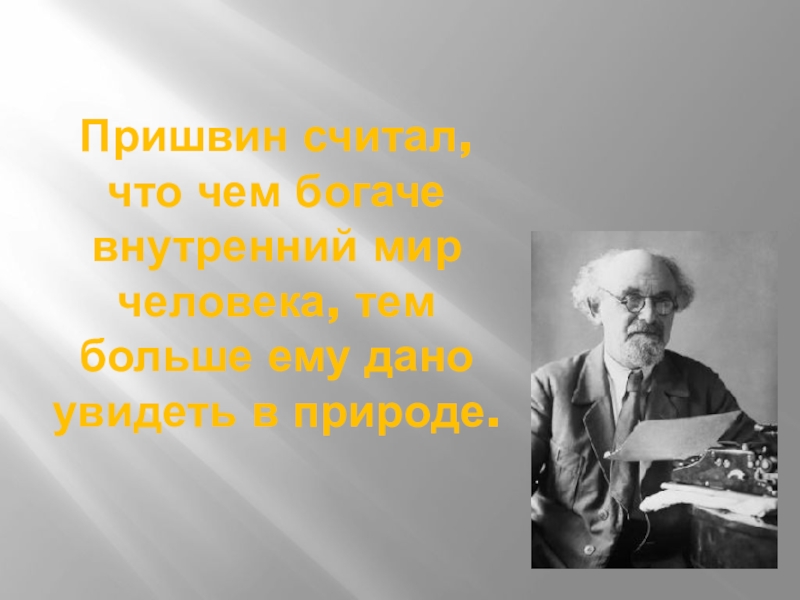 Слайд 12Пришвин считал, что чем богаче внутренний мир человека, тем больше ему