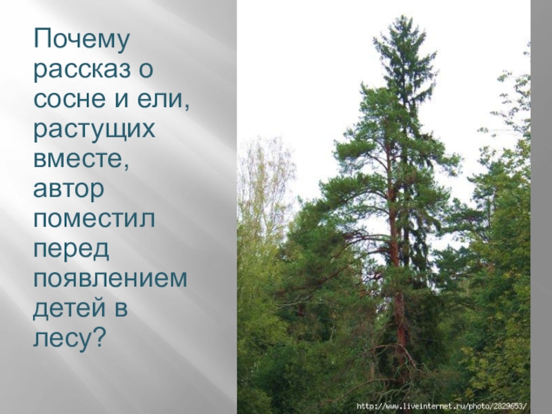 Слайд 6Почему рассказ о сосне и ели, растущих вместе, автор поместил перед