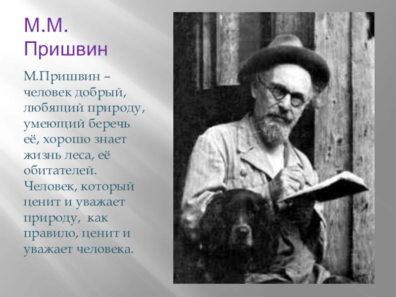 М.М. ПришвинМ.Пришвин – человек добрый, любящий природу, умеющий беречь её, хорошо знает жизнь леса, её обитателей. Человек,