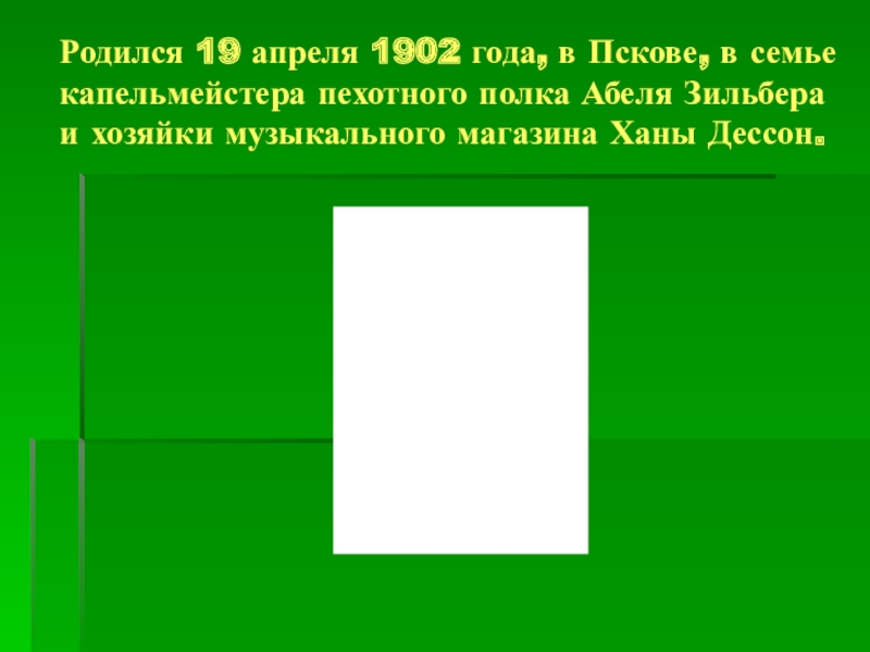 Слайд 3Родился 19 апреля 1902 года, в Пскове, в семье капельмейстера пехотного