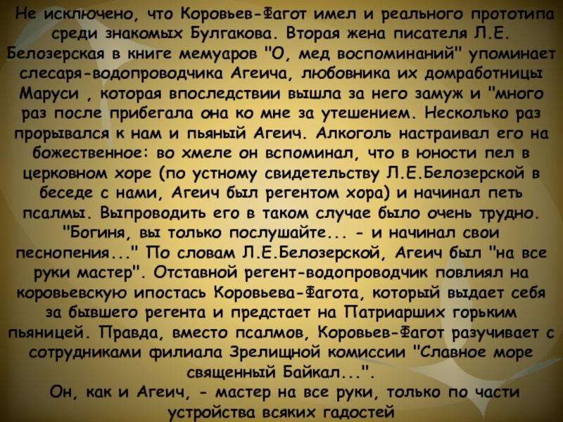 Булгакова. Вторая жена писателя Л.Е.Белозерская в книге мемуаров "О, мед воспоминаний" упоминает слесаря-водопроводчика Агеича, любовника их домработницы Маруси , которая впоследствии вышла за него замуж и "много раз после прибегала она ко мне за утешением. Несколько раз прорывался к нам и пьяный Агеич. Алкоголь настраивал его на божественное: во хмеле он вспоминал, что в юности пел в церковном хоре (по устному свидетельству Л.Е.Белозерской в беседе с нами, Агеич был регентом хора) и начинал петь псалмы. Выпроводить его в таком случае было очень трудно. "Богиня, вы только послушайте... - и начинал свои песнопения..." По словам Л.Е.Белозерской, Агеич был "на все руки мастер". Отставной регент-водопроводчик повлиял на коровьевскую ипостась Коровьева-Фагота, который выдает себя за бывшего регента и предстает на Патриарших горьким пьяницей. Правда, вместо псалмов, Коровьев-Фагот разучивает с сотрудниками филиала Зрелищной комиссии "Славное море священный Байкал...".