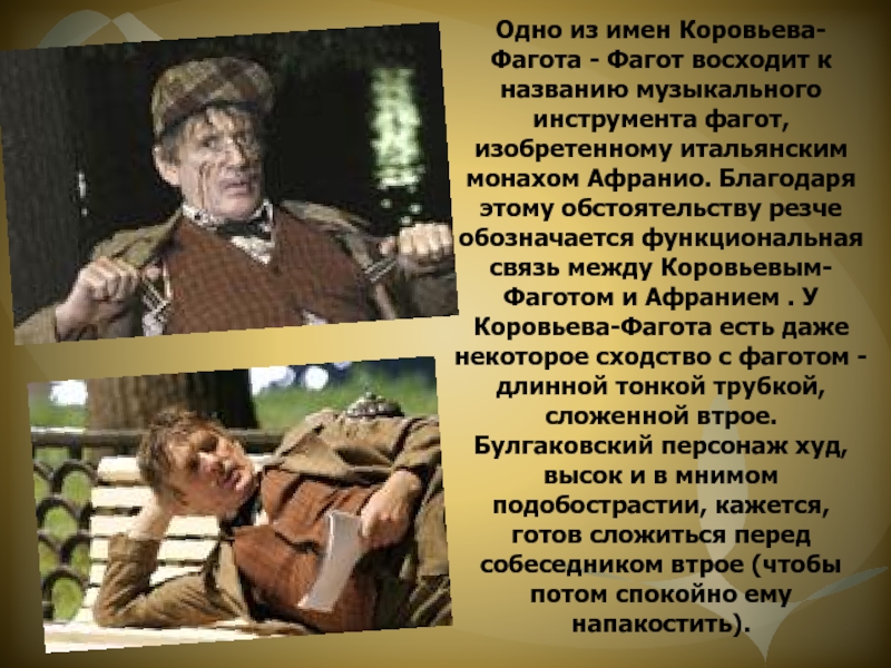 фагот, изобретенному итальянским монахом Афранио. Благодаря этому обстоятельству резче обозначается функциональная связь между Коровьевым-Фаготом и Афранием . У Коровьева-Фагота есть даже некоторое сходство с фаготом - длинной тонкой трубкой, сложенной втрое. Булгаковский персонаж худ, высок и в мнимом подобострастии, кажется, готов сложиться перед собеседником втрое (чтобы потом спокойно ему напакостить).
