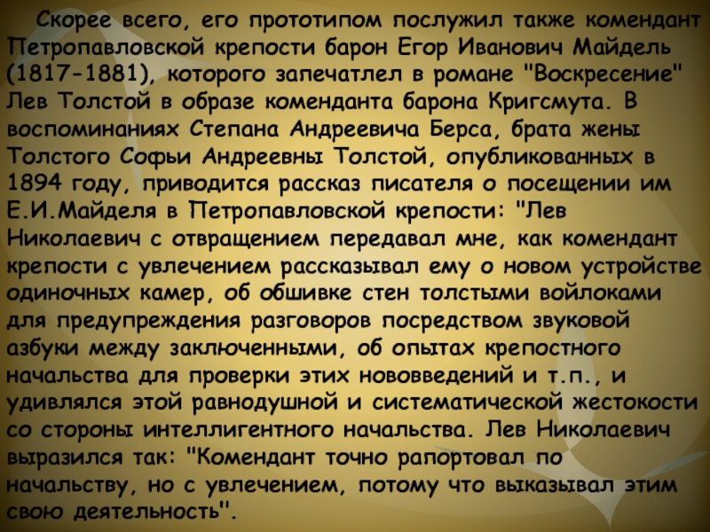 барон Егор Иванович Майдель (1817-1881), которого запечатлел в романе "Воскресение" Лев Толстой в образе коменданта барона Кригсмута. В воспоминаниях Степана Андреевича Берса, брата жены Толстого Софьи Андреевны Толстой, опубликованных в 1894 году, приводится рассказ писателя о посещении им Е.И.Майделя в Петропавловской крепости: "Лев Николаевич с отвращением передавал мне, как комендант крепости с увлечением рассказывал ему о новом устройстве одиночных камер, об обшивке стен толстыми войлоками для предупреждения разговоров посредством звуковой азбуки между заключенными, об опытах крепостного начальства для проверки этих нововведений и т.п., и удивлялся этой равнодушной и систематической жестокости со стороны интеллигентного начальства. Лев Николаевич выразился так: "Комендант точно рапортовал по начальству, но с увлечением, потому что выказывал этим свою деятельность".