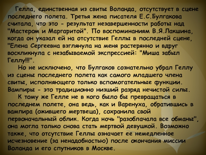 полета. Третья жена писателя Е.С.Булгакова считала, что это - результат незавершенности работы над "Мастером и Маргаритой". По воспоминаниям В.Я.Лакшина, когда он указал ей на отсутствие Геллы в последней сцене, "Елена Сергеевна взглянула на меня растерянно и вдруг воскликнула с незабываемой экспрессией: "Миша забыл Геллу!!!".