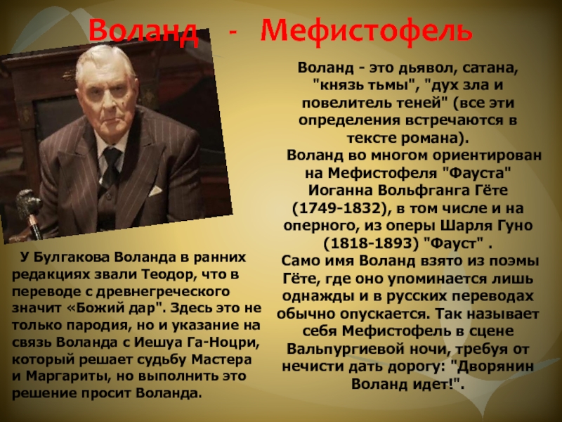 Воланд во многом ориентирован на Мефистофеля "Фауста" Иоганна Вольфганга Гёте (1749-1832), в том числе и на оперного, из оперы Шарля Гуно (1818-1893) "Фауст" .