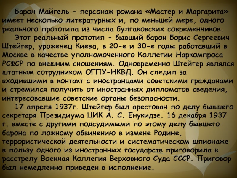 Слайд 22 Барон Майгель - персонаж романа «Мастер и Маргарита» имеет