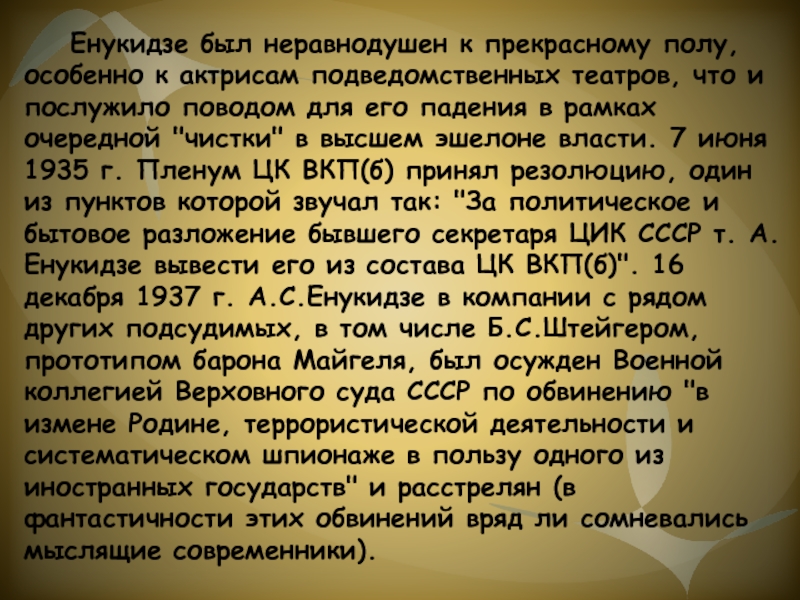 подведомственных театров, что и послужило поводом для его падения в рамках очередной "чистки" в высшем эшелоне власти. 7 июня 1935 г. Пленум ЦК ВКП(б) принял резолюцию, один из пунктов которой звучал так: "За политическое и бытовое разложение бывшего секретаря ЦИК СССР т. А.Енукидзе вывести его из состава ЦК ВКП(б)". 16 декабря 1937 г. А.С.Енукидзе в компании с рядом других подсудимых, в том числе Б.С.Штейгером, прототипом барона Майгеля, был осужден Военной коллегией Верховного суда СССР по обвинению "в измене Родине, террористической деятельности и систематическом шпионаже в пользу одного из иностранных государств" и расстрелян (в фантастичности этих обвинений вряд ли сомневались мыслящие современники).
