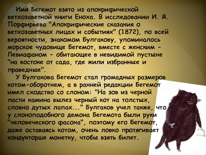 исследовании И. Я. Порфирьева "Апокрифические сказания о ветхозаветных лицах и событиях" (1872), по всей вероятности, знакомом Булгакову, упоминалось морское чудовище Бегемот, вместе с женским - Левиафаном - обитающее в невидимой пустыне "на востоке от сада, где жили избранные и праведные".