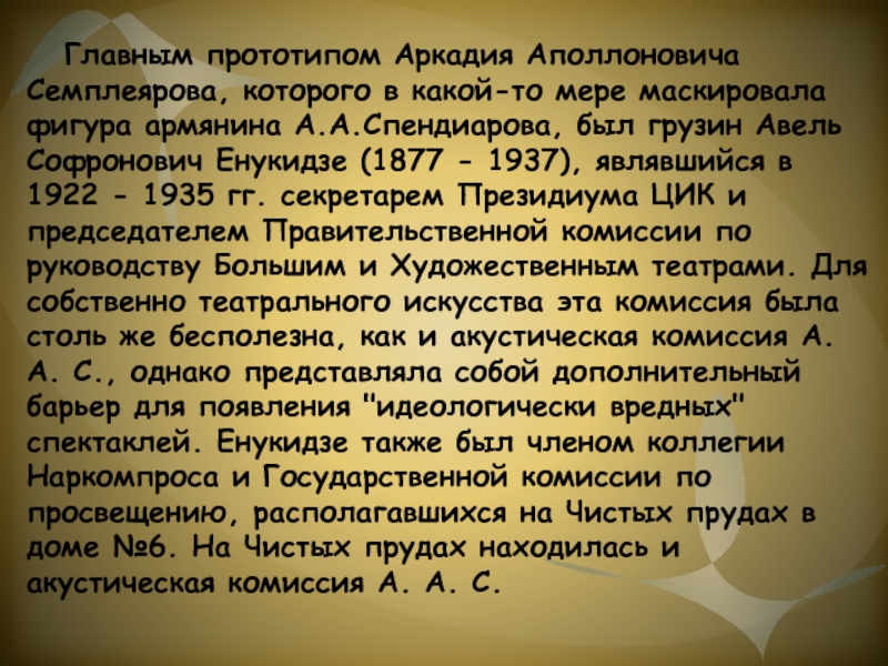 маскировала фигура армянина А.А.Спендиарова, был грузин Авель Софронович Енукидзе (1877 - 1937), являвшийся в 1922 - 1935 гг. секретарем Президиума ЦИК и председателем Правительственной комиссии по руководству Большим и Художественным театрами. Для собственно театрального искусства эта комиссия была столь же бесполезна, как и акустическая комиссия А. А. С., однако представляла собой дополнительный барьер для появления "идеологически вредных" спектаклей. Енукидзе также был членом коллегии Наркомпроса и Государственной комиссии по просвещению, располагавшихся на Чистых прудах в доме №6. На Чистых прудах находилась и акустическая комиссия А. А. С.