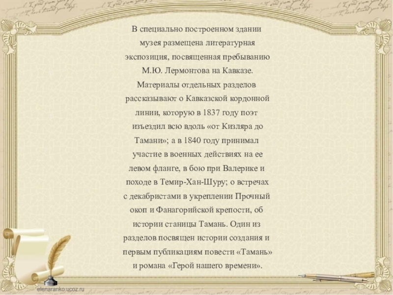Слайд 10Музей Лермонтова в Тамани посвящён периоду пребывания поэта в станице по
