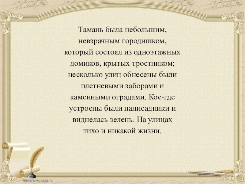 Слайд 5Тамань была небольшим, невзрачным городишком, который состоял из одноэтажных домиков, крытых