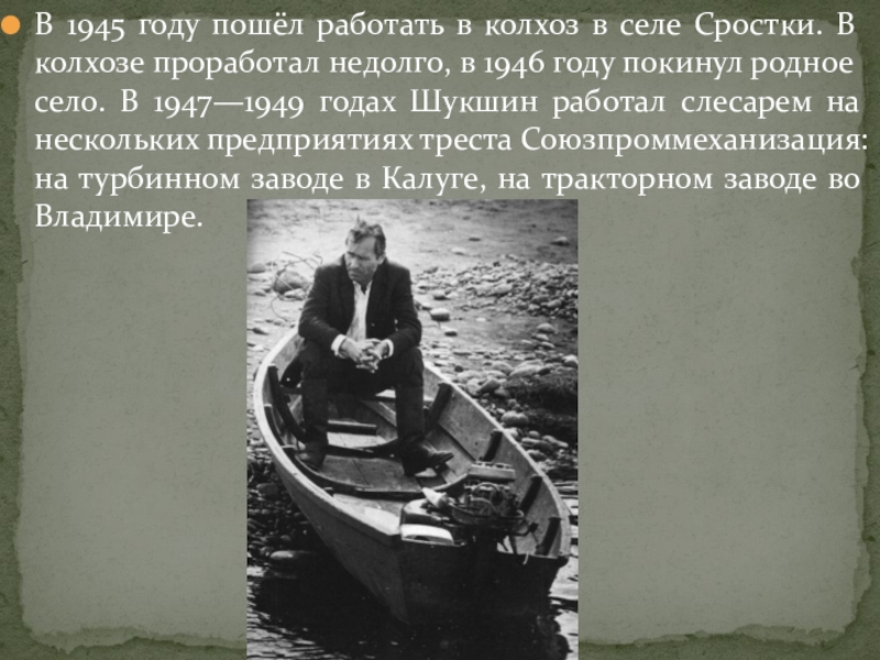 Слайд 9В 1945 году пошёл работать в колхоз в селе Сростки. В