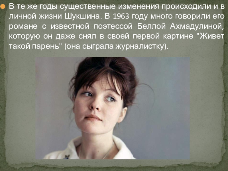 Шукшина. В 1963 году много говорили его романе с известной поэтессой Беллой Ахмадулиной, которую он даже снял в своей первой картине "Живет такой парень" (она сыграла журналистку).