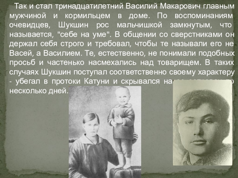 доме. По воспоминаниям очевидцев, Шукшин рос мальчишкой замкнутым, что называется, "себе на уме". В общении со сверстниками он держал себя строго и требовал, чтобы те называли его не Васей, а Василием. Те, естественно, не понимали подобных просьб и частенько насмехались над товарищем. В таких случаях Шукшин поступал соответственно своему характеру - убегал в протоки Катуни и скрывался на ее островах по несколько дней.