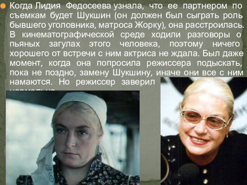 Слайд 21Когда Лидия Федосеева узнала, что ее партнером по съемкам будет Шукшин (он должен