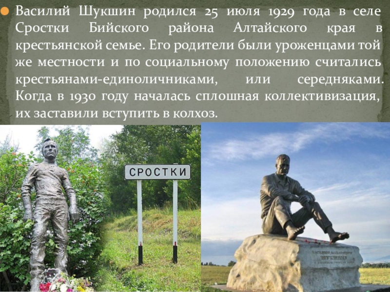 Слайд 2Василий Шукшин родился 25 июля 1929 года в селе Сростки Бийского
