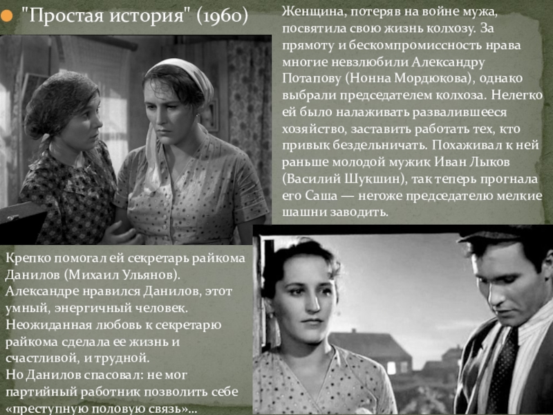 Крепко помогал ей секретарь райкома Данилов (Михаил Ульянов). Александре нравился Данилов, этот умный, энергичный человек. Неожиданная любовь к секретарю райкома сделала ее жизнь и счастливой, и трудной.