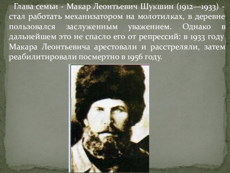 Слайд 3 Глава семьи - Макар Леонтьевич Шукшин (1912—1933) - стал работать механизатором
