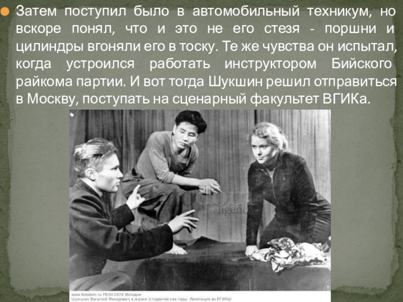 это не его стезя - поршни и цилиндры вгоняли его в тоску. Те же чувства он испытал, когда устроился работать инструктором Бийского райкома партии. И вот тогда Шукшин решил отправиться в Москву, поступать на сценарный факультет ВГИКа.