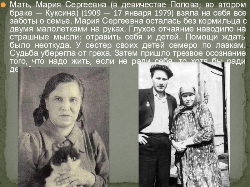 Слайд 4Мать, Мария Сергеевна (в девичестве Попова; во втором браке — Куксина)