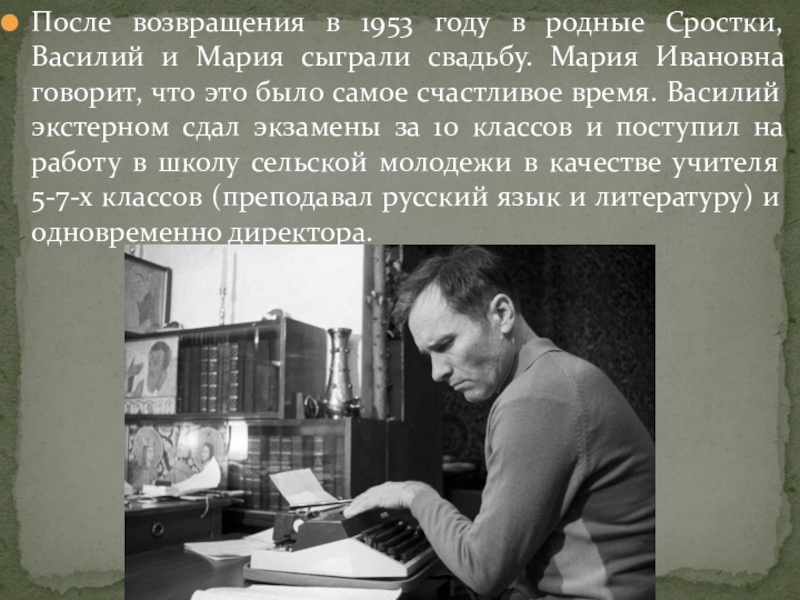 сыграли свадьбу. Мария Ивановна говорит, что это было самое счастливое время. Василий экстерном сдал экзамены за 10 классов и поступил на работу в школу сельской молодежи в качестве учителя 5-7-х классов (преподавал русский язык и литературу) и одновременно директора.