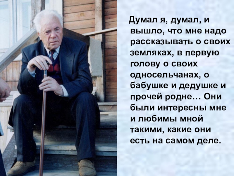 о своих земляках, в первую голову о своих односельчанах, о бабушке и дедушке и прочей родне… Они были интересны мне и любимы мной такими, какие они есть на самом деле.