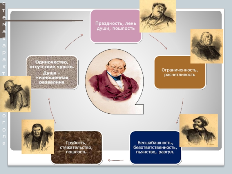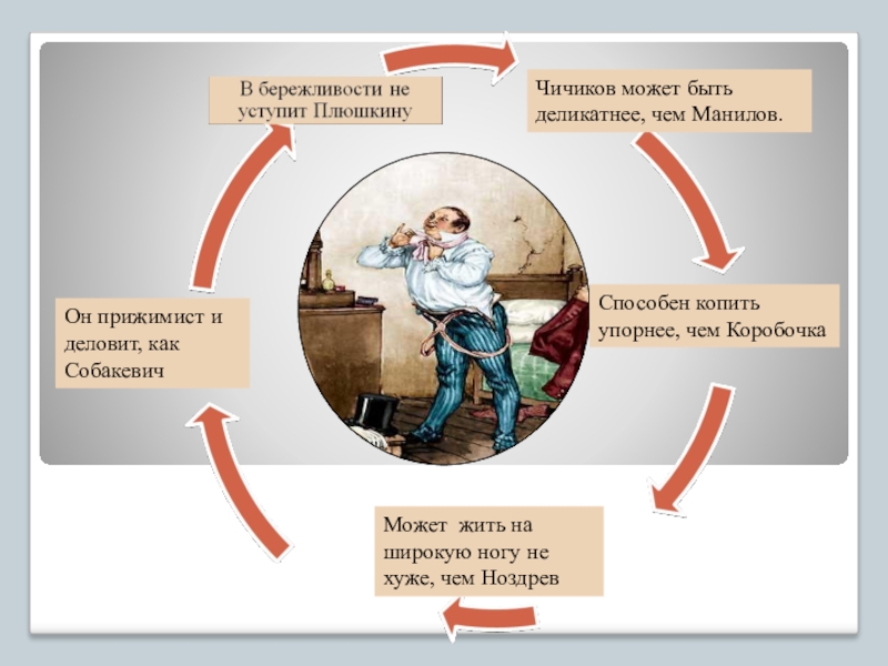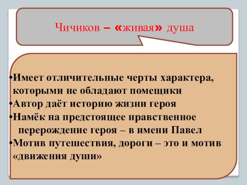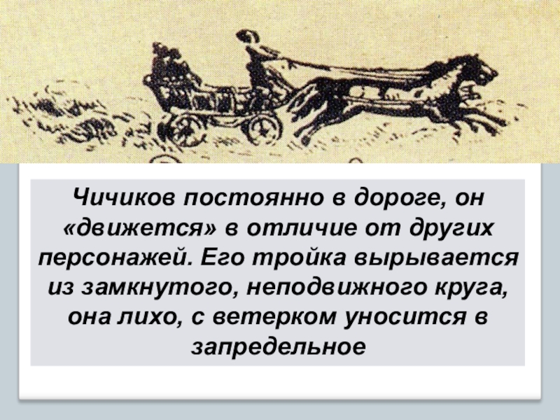 Чичиков постоянно в дороге, он «движется» в отличие от других персонажей. Его тройка вырывается из замкнутого, неподвижного круга, она лихо, с ветерком уносится в запредельное