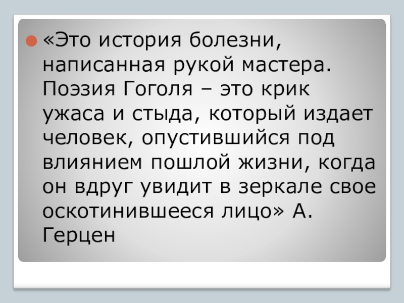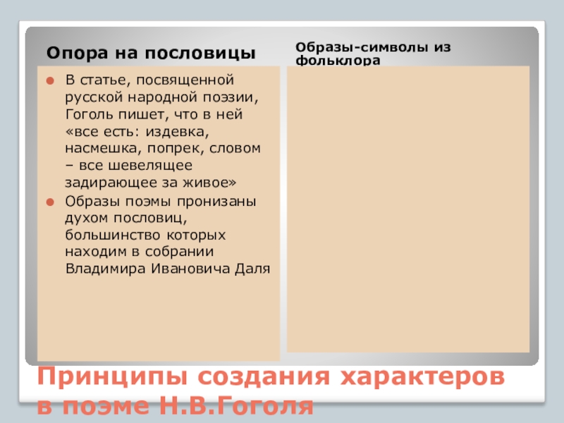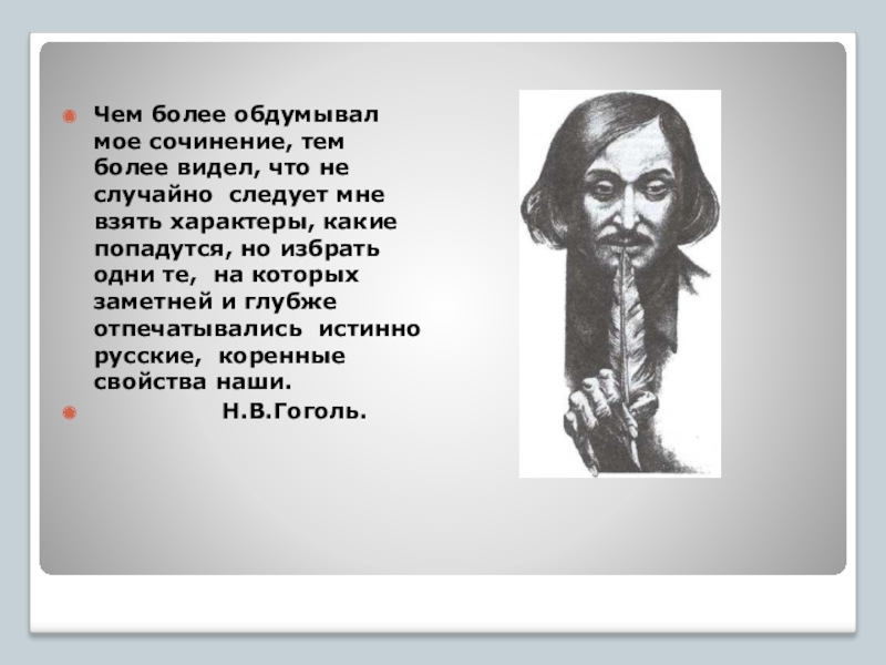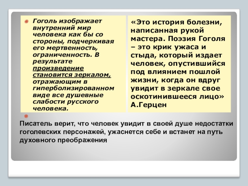 Гоголь изображает внутренний мир человека как бы со стороны, подчеркивая его мертвенность, ограниченность. В результате произведение становится зеркалом, отражающим в гиперболизированном виде все душевные слабости русского человека.