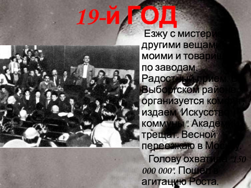 по заводам. Радостный прием. В Выборгском районе организуется комфут, издаем "Искусство коммуны". Академии трещат. Весной переезжаю в Москву.