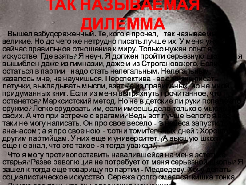 - так называемые великие. Но до чего же нетрудно писать лучше их. У меня уже и сейчас правильное отношение к миру. Только нужен опыт в искусстве. Где взять? Я неуч. Я должен пройти серьезную школу. А я вышиблен даже из гимназии, даже и из Строгановского. Если остаться в партии - надо стать нелегальным. Нелегальным, казалось мне, не научишься. Перспектива - всю жизнь писать летучки, выкладывать мысли, взятые из правильных, но не мной придуманных книг. Если из меня вытряхнуть прочитанное, что останется? Марксистский метод. Но не в детские ли руки попало это оружие? Легко орудовать им, если имеешь дело только с мыслью своих. А что при встрече с врагами? Ведь вот лучше Белого я все-таки не могу написать. Он про свое весело - "в небеса запустил ананасом", а я про свое ною - "сотни томительных дней". Хорошо другим партийцам. У них еще и университет. (А высшую школу - я еще не знал, что это такое - я тогда уважал!)