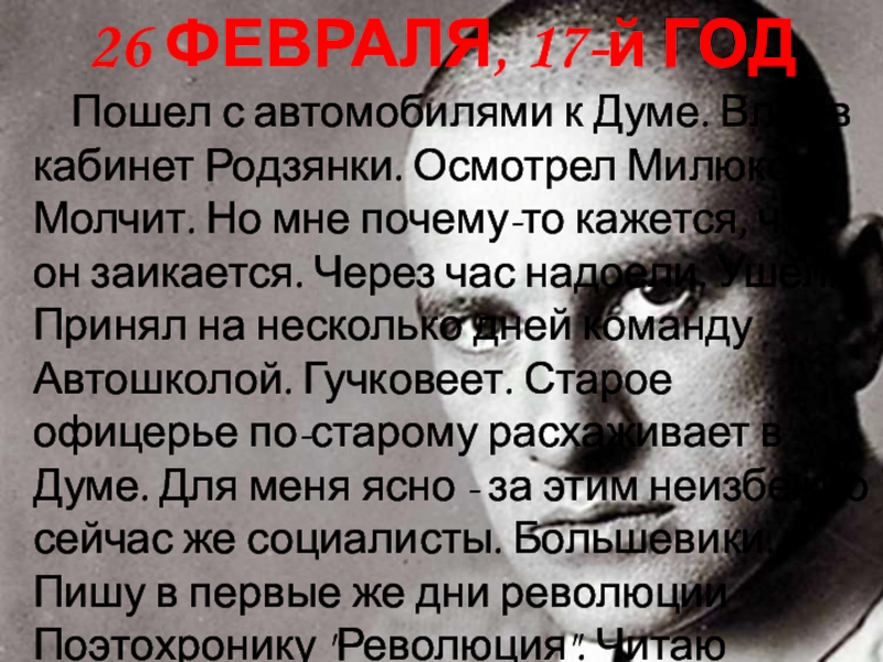 в кабинет Родзянки. Осмотрел Милюкова. Молчит. Но мне почему-то кажется, что он заикается. Через час надоели. Ушел. Принял на несколько дней команду Автошколой. Гучковеет. Старое офицерье по-старому расхаживает в Думе. Для меня ясно - за этим неизбежно сейчас же социалисты. Большевики. Пишу в первые же дни революции Поэтохронику "Революция". Читаю лекции - "Большевики искусства".