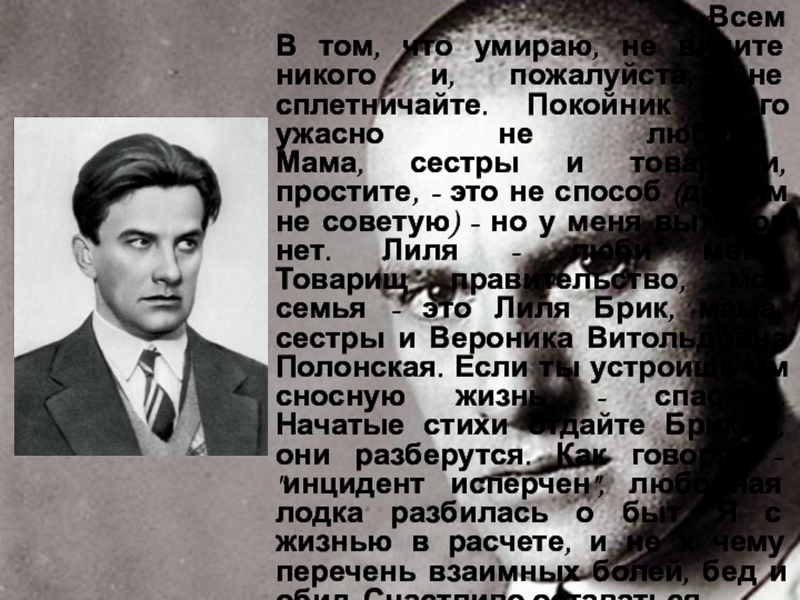Товарищ правительство, моя семья - это Лиля Брик, мама, сестры и Вероника Витольдовна Полонская. Если ты устроишь им сносную жизнь - спасибо. Начатые стихи отдайте Брикам, они разберутся. Как говорят - "инцидент исперчен", любовная лодка разбилась о быт. Я с жизнью в расчете, и не к чему перечень взаимных болей, бед и обид. Счастливо оставаться.