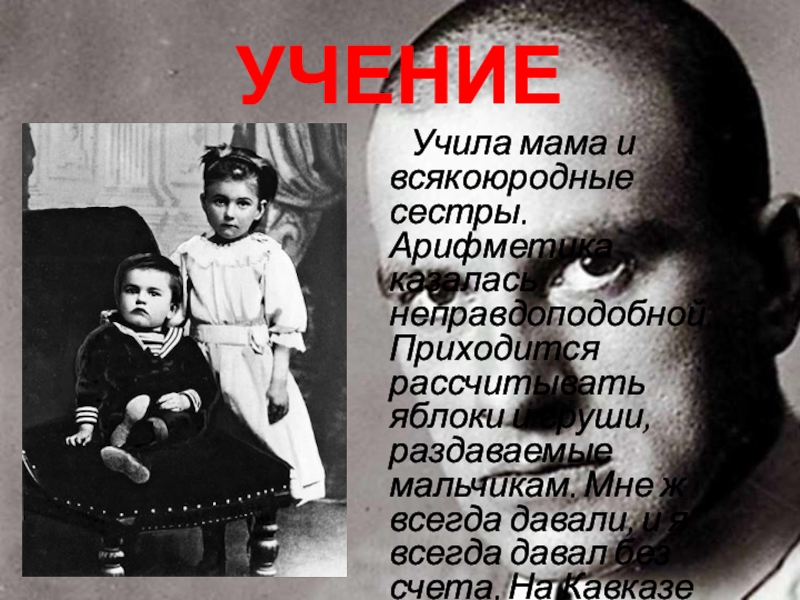 яблоки и груши, раздаваемые мальчикам. Мне ж всегда давали, и я всегда давал без счета. На Кавказе фруктов сколько угодно. Читать выучился с удовольствием.