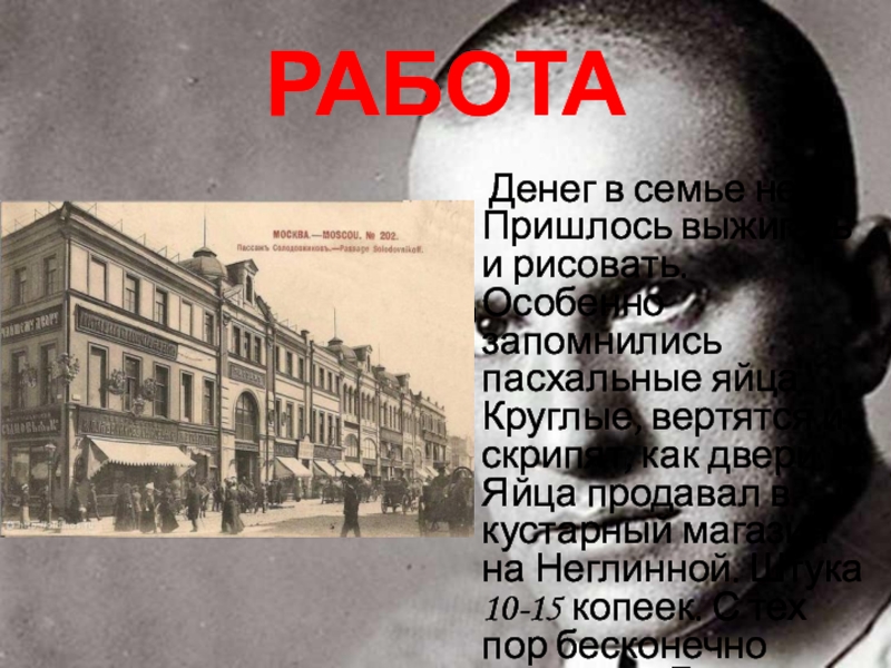 Особенно запомнились пасхальные яйца. Круглые, вертятся и скрипят, как двери. Яйца продавал в кустарный магазин на Неглинной. Штука 10-15 копеек. С тех пор бесконечно ненавижу Бемов, русский стиль и кустарщину.