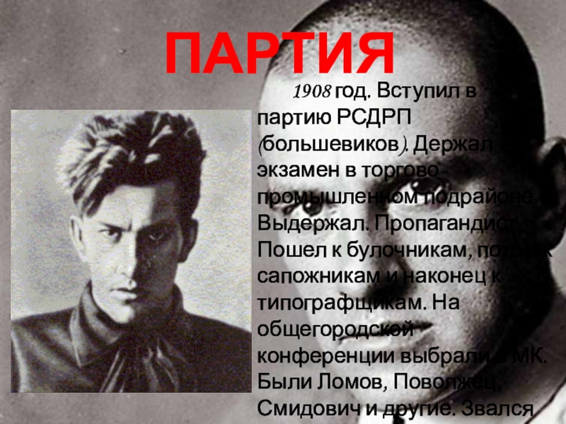 Держал экзамен в торгово-промышленном подрайоне. Выдержал. Пропагандист. Пошел к булочникам, потом к сапожникам и наконец к типографщикам. На общегородской конференции выбрали в МК. Были Ломов, Поволжец, Смидович и другие. Звался "товарищем Константином". Здесь работать не пришлось - взяли.