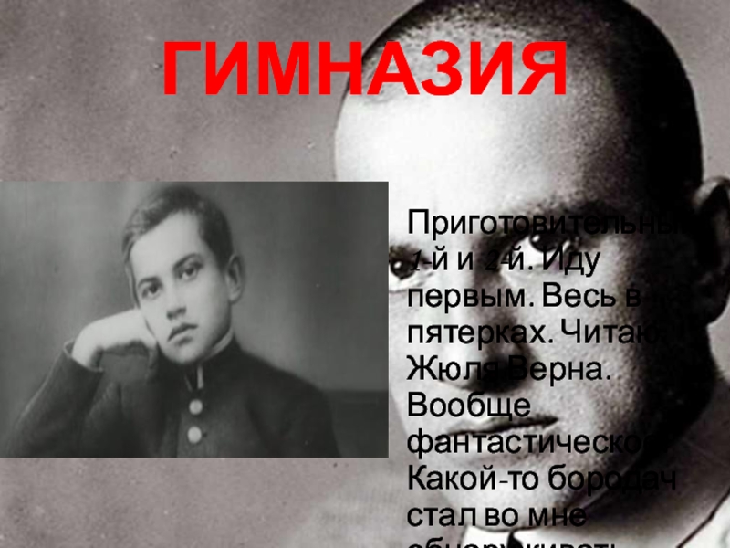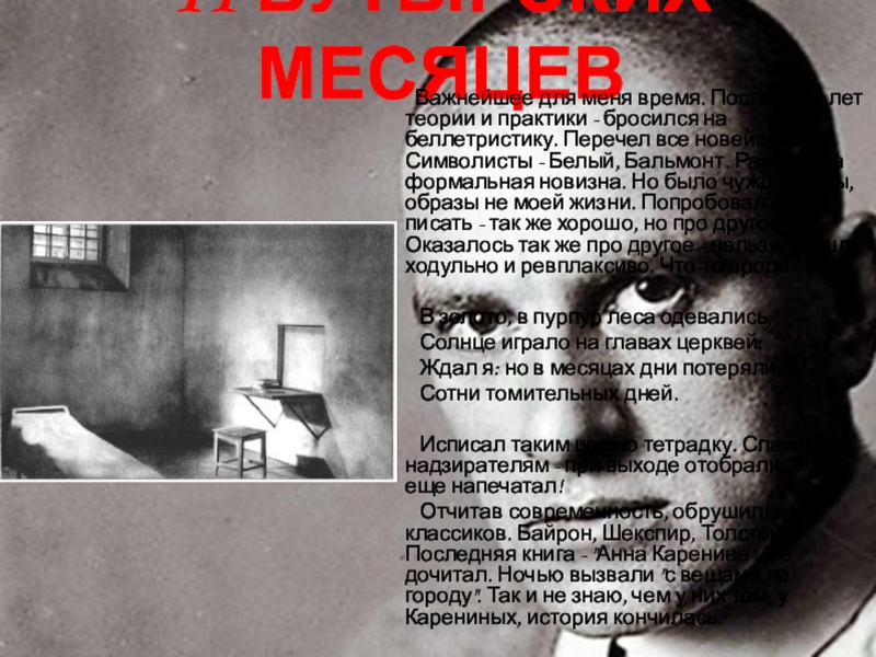 лет теории и практики - бросился на беллетристику. Перечел все новейшее. Символисты - Белый, Бальмонт. Разобрала формальная новизна. Но было чуждо. Темы, образы не моей жизни. Попробовал сам писать - так же хорошо, но про другое. Оказалось так же про другое - нельзя. Вышло ходульно и ревплаксиво. Что-то вроде:
