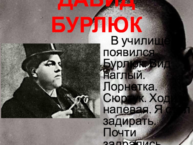 В училище появился Бурлюк. Вид наглый. Лорнетка.