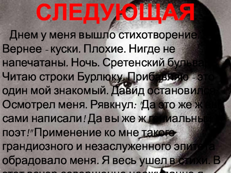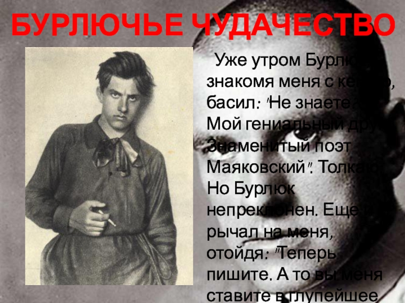 знаете? Мой гениальный друг. Знаменитый поэт Маяковский". Толкаю. Но Бурлюк непреклонен. Еще и рычал на меня, отойдя: "Теперь пишите. А то вы меня ставите в глупейшее положение".