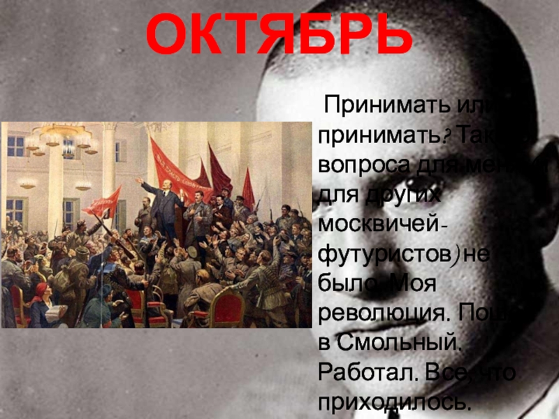 других москвичей-футуристов) не было. Моя революция. Пошел в Смольный. Работал. Все, что приходилось. Начинают заседать.