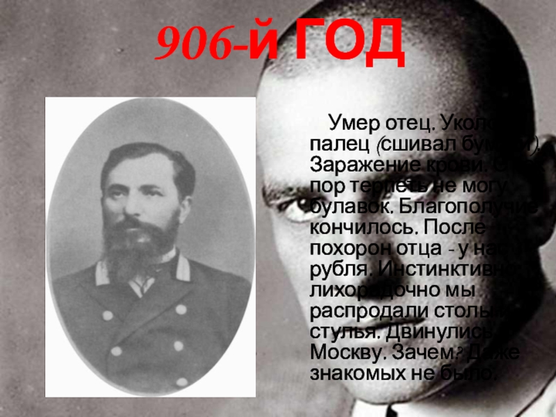 крови. С тех пор терпеть не могу булавок. Благополучие кончилось. После похорон отца - у нас 3 рубля. Инстинктивно, лихорадочно мы распродали столы и стулья. Двинулись в Москву. Зачем? Даже знакомых не было.
