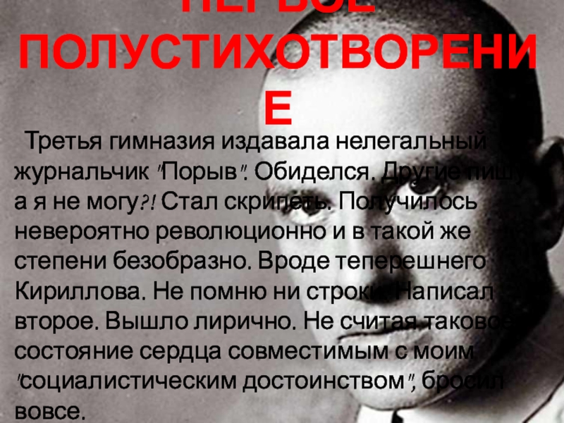 а я не могу?! Стал скрипеть. Получилось невероятно революционно и в такой же степени безобразно. Вроде теперешнего Кириллова. Не помню ни строки. Написал второе. Вышло лирично. Не считая таковое состояние сердца совместимым с моим "социалистическим достоинством", бросил вовсе.