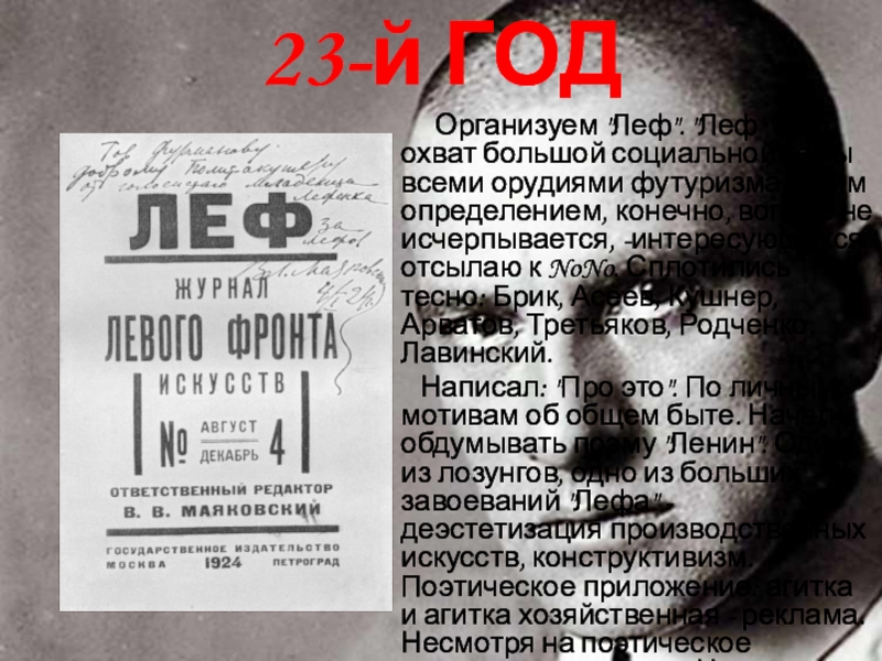 Написал: "Про это". По личным мотивам об общем быте. Начал обдумывать поэму "Ленин". Один из лозунгов, одно из больших завоеваний "Лефа" - деэстетизация производственных искусств, конструктивизм. Поэтическое приложение: агитка и агитка хозяйственная - реклама. Несмотря на поэтическое улюлюканье, считаю "Нигде кроме как в Моссельпроме" поэзией самой высокой квалификации.