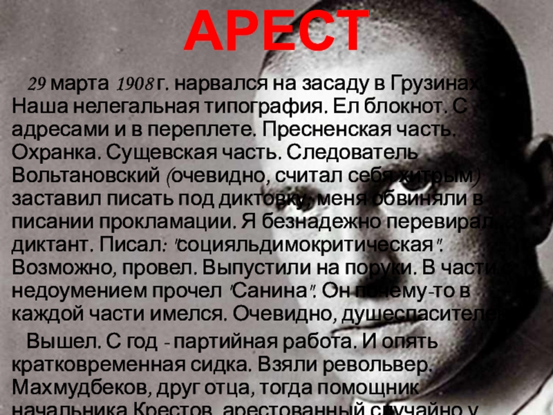 Наша нелегальная типография. Ел блокнот. С адресами и в переплете. Пресненская часть. Охранка. Сущевская часть. Следователь Вольтановский (очевидно, считал себя хитрым) заставил писать под диктовку; меня обвиняли в писании прокламации. Я безнадежно перевирал диктант. Писал: "социяльдимокритическая". Возможно, провел. Выпустили на поруки. В части с недоумением прочел "Санина". Он почему-то в каждой части имелся. Очевидно, душеспасителен.